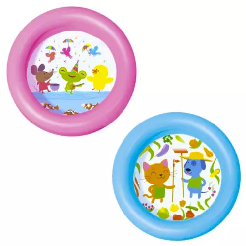 - SPECYFIKACJA – materiał: PVC; kolor: różowy / niebieski; rodzaj: dmuchany; kształt: okrągły; wiek: 2+; pojemność: 21 l.; wymiary (śr/wys): 61/15 cm; waga: 230 g; waga: 247 g.