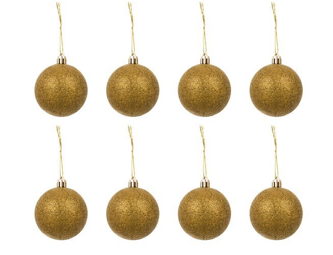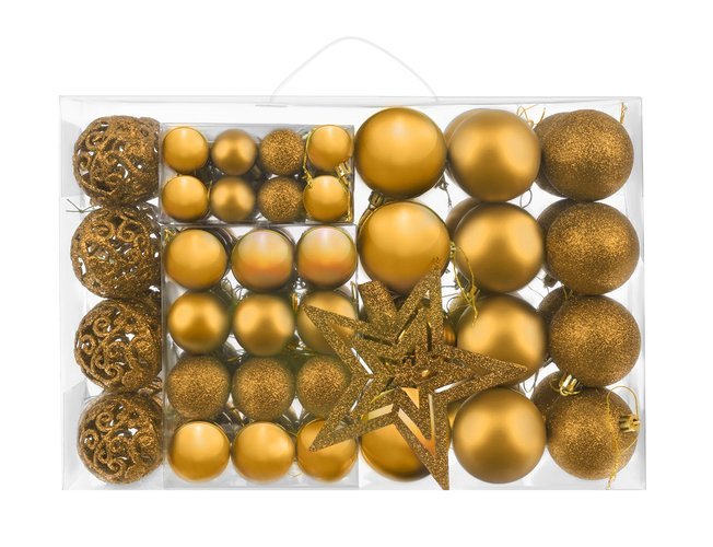 - SPECYFIKACJA – kolor: złoty; materiał: tworzywo sztuczne; ilość sztuk w zestawie: 100 + gwiazda; rodzaje bombek: matowe, brokatowe, błyszczące, ażurowe; średnice bombek: 6/4/3 cm; wymiary gwiazdy (dł/szer): 12/14 cm; waga: 0,7 kg; waga w opakowaniu: 0,9 kg.