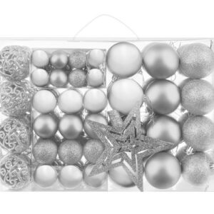 BOMBKI CHOINKOWE SREBRNE 100szt + CZUBEK GWIAZDA GRATIS! RÓŻNE WIELKOŚCI I RODZAJE – na komplet bombek składają się aż 4 klasyczne wzory oraz 3 wielkości, które przypadną do gustu każdemu. Ozdoby posiadają średnicę 3, 4 i 6 centymetrów. Posiadają matową, brokatową oraz błyszczącą powierzchnię. Bombki z efektownym ażurowym wykończeniem również znajdują się w zestawie. Piękna brokatowa gwiazda będzie zwieńczeniem procesu ozdabiania drzewka…