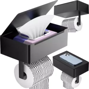 METALOWY UCHWYT NA PAPIER TOALETOWY Z PÓŁKĄ W STYLU LOFT Z PUŁKĄ – uchwyt na papier toaletowy z zamykana półką na mokre chusteczki ma dwuwarstwową strukturę. Pudełko do przechowywania mokrych chusteczek lub produktów kobiecych, a poniżej uchwyt na papier toaletowy. Niezbędne przedmioty są dobrze zorganizowane, a półka na górze może być wykorzystana do tymczasowego położenia telefonu,…