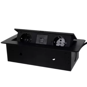 GNIAZDO WPUSZCZANE / CHOWANE W BLAT NABLATOWE CZARNE Z USB 2 GNIAZDKA + 2 USB – listwa składa się z 2 gniazd sieciowych z uziemieniem typu schuko + 2 gniazda USB 2.1 w obudowie chowanej w blat. Obudowa wykonana jest z wysokiej jakości aluminium malowanego proszkowo. Dodatkowe porty USB umożliwiają np. ładowanie telefonu bezpośrednio z gniazda. DYSKRETNY…