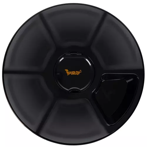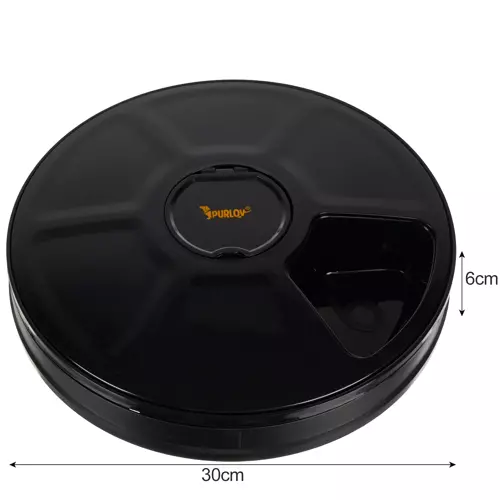 - 6 KOMÓR – miska posiada 6 komór o pojemności 150ml każda. 5 jest zasłoniętych, a jedna otwarta. System otwierania czasowego podczas obracania pokrywy otwiera w określonym czasie jedną komorę z jedzeniem.