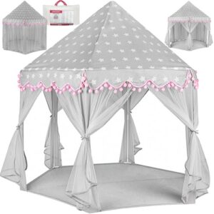 NAMIOT RÓŻOWY PAŁAC DLA DZIECI DO DOMU I OGRODU DUŻY – rozmiar domku pozwala na przebywanie w nim jednocześnie kilkorga dzieci lub na umieszczenie w środku wielu maskotek, poduszek czy innych akcesoriów zapewniając jednocześnie komfort i świetną zabawę. ATRAKCYJNY WYGLĄD – namiot jest ciekawy wizualnie. Ma podstawę sześciokąta, posiada 6 otworów wejściowych i daszek w kształcie ostrosłupa….