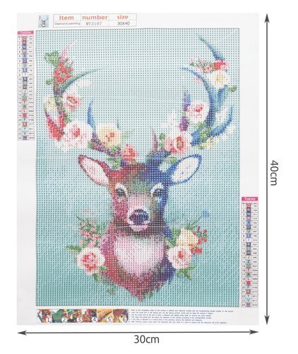 • SPECYFIKACJA – wzór: jeleń; płótno pokryte warstwą klejącą: tak; w zestawie: kolorowe diamenciki, aplikator, suchy klej, pojemnik; wymiar: 30×40 cm; wymiar obrazka: 25x35cm; waga: 0,1 kg; waga w opakowaniu: 0,103 kg