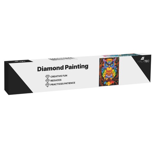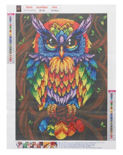 - SPECYFIKACJA – wzór: sowa; wymiar płótna: 30×40 cm; wymiar obrazka: 25x35cm, płótno pokryte warstwą klejącą: tak; w zestawie: kolorowe diamenciki, aplikator, suchy klej, pojemnik; waga: 0,114 kg;