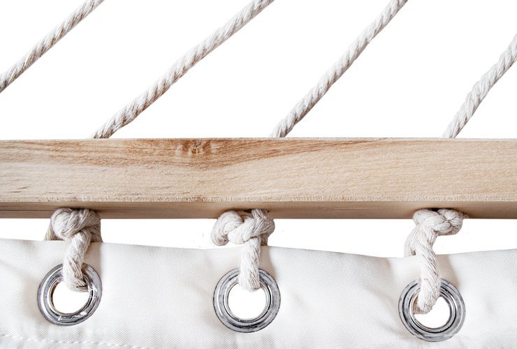 - DREWNIANE POPRZECZKI – dzięki temu, że hamak posiada drewniane poprzeczki – rozkłada się jak łóżko. Możesz się w nim swobodnie opalać, czytać oraz obserwować otoczenie bez obawy, że się zwinie. Świetnie sprawdzi się zamontowany na stałe w ogrodzie, na tarasie lub w pokoju.