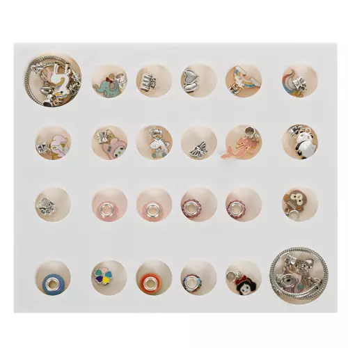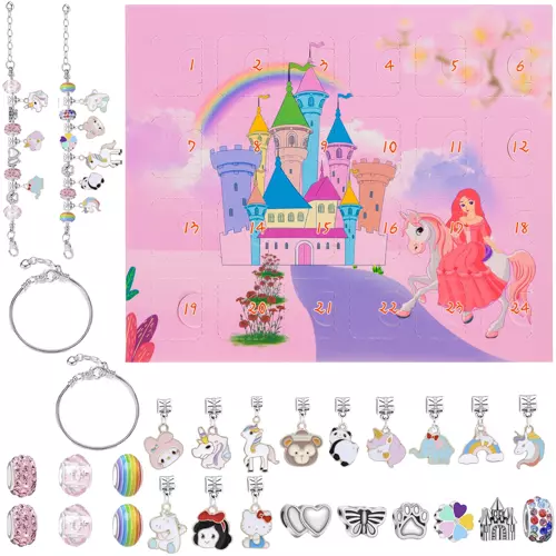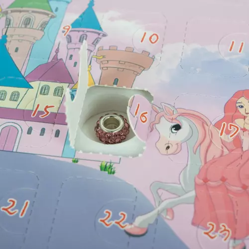- 2 BRANSOLETKI Z ZAWIESZKAMI – wyjątkowy kalendarz adwentowy kryje w sobie biżuterię. Otwierając 24 okienka można znaleźć 2 bransoletki i 22 urocze zawieszki z bajkowymi motywami, do przypinania wedle własnego gustu i pomysłu. Na każdy dzień adwentu – jedna niespodzianka. Przepiękne pudełeczko wewnątrz kryje piankową tackę z pojedynczymi otworami.