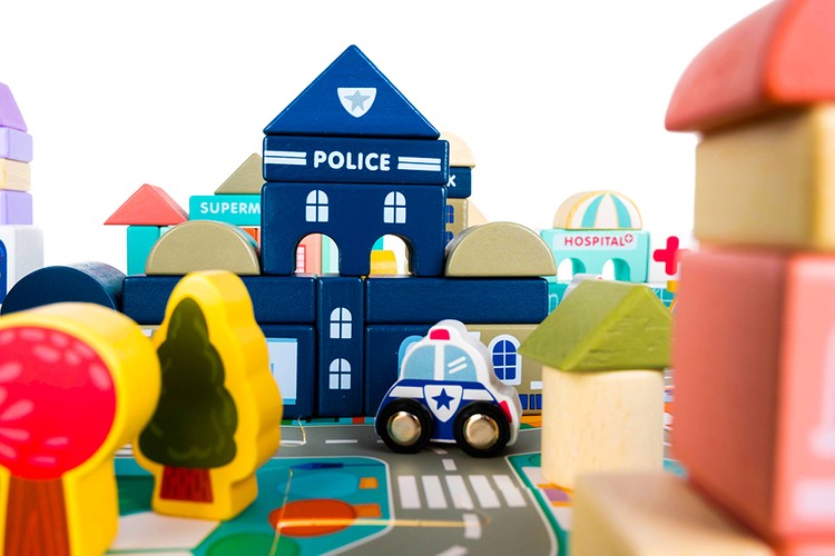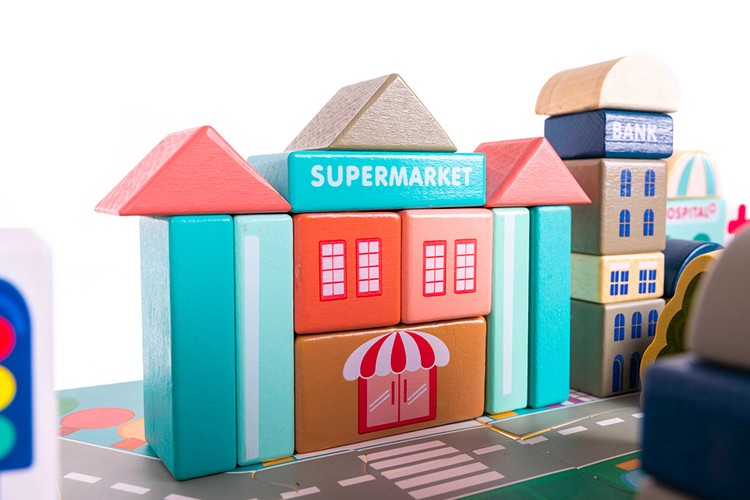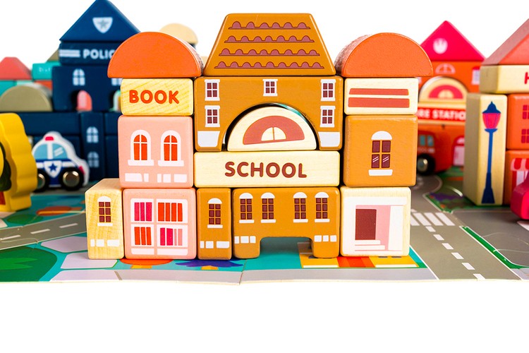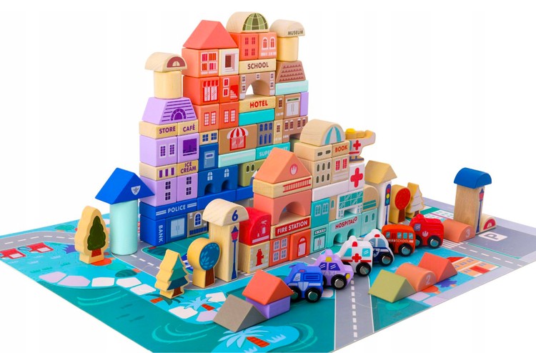 Zabawka, jaką są klocki drewniane miasto, to wiele godzin niesamowitej zabawy dla najmłodszych. Zestaw jest bardzo duży – w jego skład wchodzi aż 115 różnego rodzaju klocków i 20 szt. puzzli imitujących ulicę. Z klocków można układać różnego rodzaju budynki mieszkalne oraz budynki użyteczności publicznej, ponadto zestaw obejmuje również elementy takie jak drewniane pojazdy, znaki, latarnie, a nawet drzewka. Wszystko to sprawia, że edukacyjne klocki miasto to bardzo realistyczna zabawka, która zawsze wygrywa z nudą.