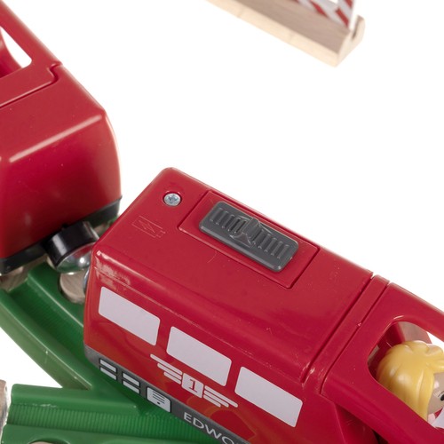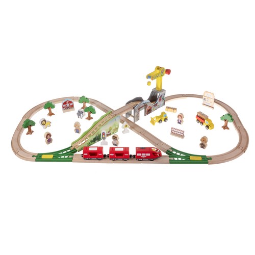 - SPECYFIKACJA – materiał: drewno; zasilanie pociągu: 1x AA (brak w zestawie); długość toru: 3,2 m; wymiary platformy (most): cm; wymiary po rozłożeniu: 115 x 45 x 21 cm; waga: 1,832 kg; waga z opakowaniem: 2,509 kg.