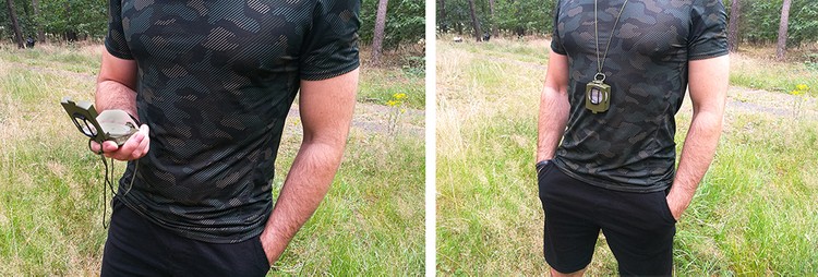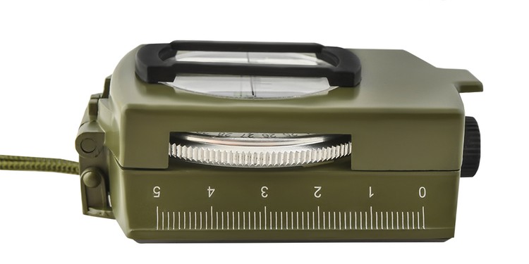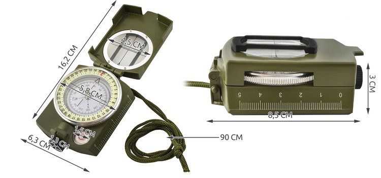 - DODATKOWE PRZYRZĄDY CELOWNICZE – kompas posiada szczerbinkę i cienką żyłkę pełniącą funkcje muszki. Pod szczerbinką znajduje się mała lupa ułatwiająca odczytywanie dokładnego kąta z tarczy kompasu. Obudowa busoli składa się także z wieczka, w którym wykonany jest podłużny otwór, przez jego środek przebiega napięta, cienka żyłka.Wewnątrz kompasu znajduję się celownik.