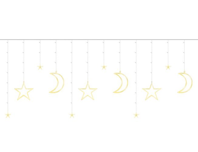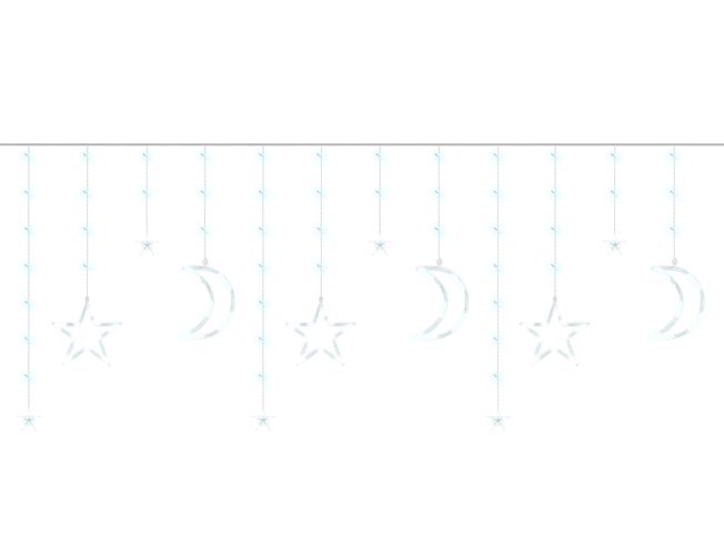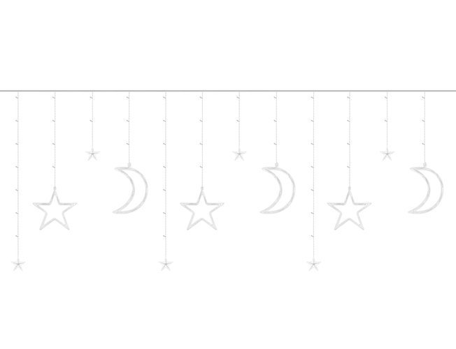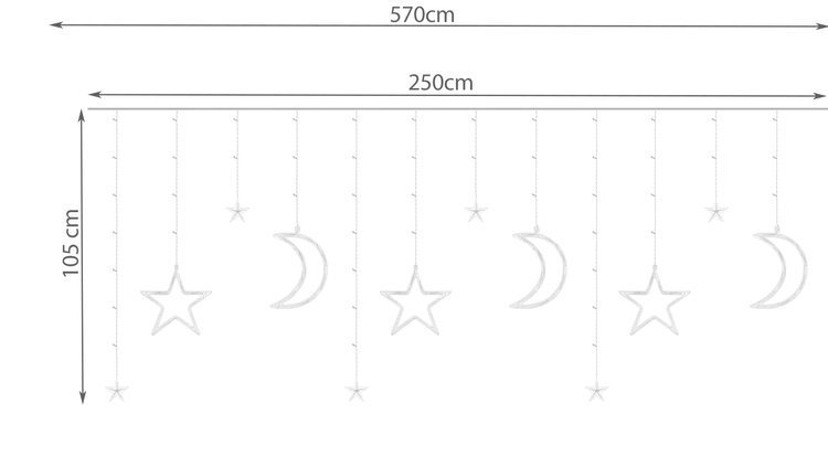 - SPECYFIKACJA – ilość trybów: 8; rodzaj oświetlenia; LED; barwa światła: ciepły biały; ilość diod: 138; klasa wodoodporności: IP44; sterownik: tak; zasilanie: sieć energetyczna; moc: 3,6W; napięcie: 230V / 31V; długość całkowita: 570 cm; długość sopla: 105/80/45 cm; waga: 0,55 kg; waga w opakowaniu: 0,62 kg.