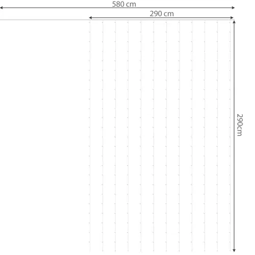 - SPECYFIKACJA – ilość trybów: 8; rodzaj oświetlenia; LED; barwa światła: zimny biały; ilość diod: 300; klasa wodoodporności: IP44; sterownik: tak; zasilanie: sieć energetyczna; moc: 3W; napięcie: 5V; długość całkowita kabla: 580 cm; długość sopla: 290 cm; szerokość kurtyny; waga: 0,394 kg; waga w opakowaniu: 0,479 kg.