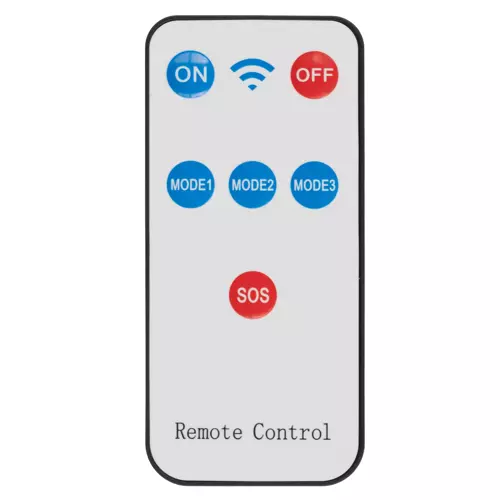 - PILOT + 4 TRYBY PRACY – wygodne sterowanie lampą odbywa się przy pomocy pilota. Posiada on przyciski Off i On oraz 3 tryby przełączania. ON- Włącz – OFF – Wyłącz MODE 1 – Tryb 1: Po wykryciu ruchu, lampa świeci 30% mocy maksymalnej przez 30 sekund. MODE 2 – Tryb 2: Po wykryciu ruchu, lampa świeci 50% mocy maksymalnej przez 30 sekund. MODE 3 – Tryb 3: Po wykryciu ruchu, lampa świeci 100% mocy maksymalnej przez 30 sekund. SOS – przycisk SOS wyłącza czujnik ruchu i czujnik zmierzchu , lampa świeci na stałe do rozładowania akumulatora na ok 50- 70% mocy.