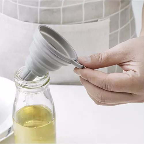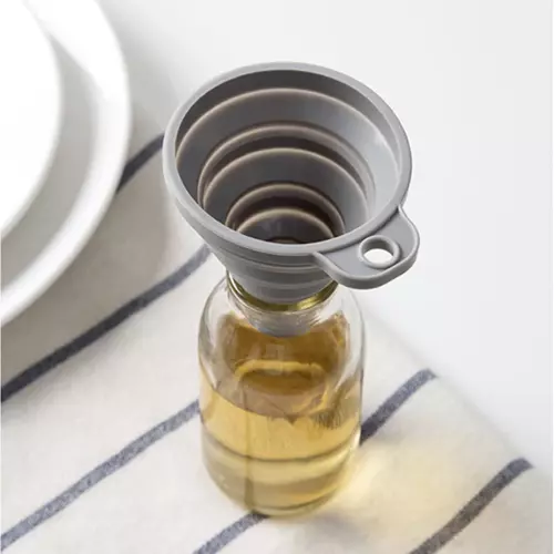 - SPECYFIKACJA – kolor: szary; materiał: silikon; składany: tak; możliwość zawieszenia: tak; wymiary: 7x8cm; średnica wlewu: 6,5cm; średnica wylewu: 1,1cm; waga: 0,02kg; waga w opakowaniu: 0,026kg.