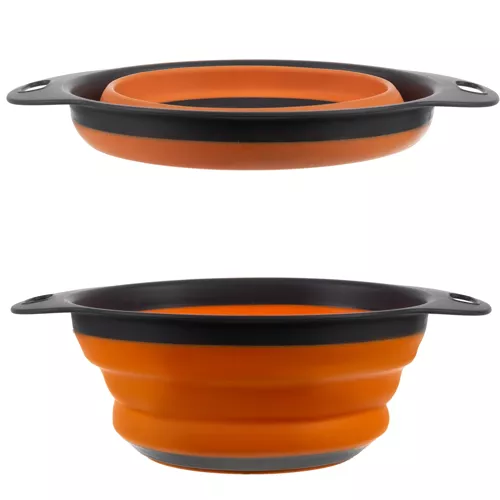 - SPECYFIKACJA – kolor: szaro / pomarańczowy; materiał: TPR + PP; temperatura w jakiej można go użytkować to -10 do 80 ?; średnica spodu: 11 cm; średnica rantu: 19 cm; wymiary po złożeniu: 24,5 x 2,5 cm; wymiary po rozłożeniu: 24,5 x 8 cm; waga: 109 g; waga w opakowaniu: 111 g.