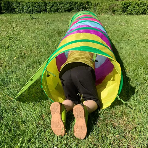 - SPECYFIKACJA – materiał: poszycie: poliester + pianka EPE, stelaż: stal, pokrowiec: poliester + PP; kolor: wielokolorowy; wymiar etui: 51 cm; wymiar tunelu: 46 x 165 cm; wymiar całkowity: 66 x 75 x 165 cm; waga: 740 g; waga w opakowaniu: 750 g.