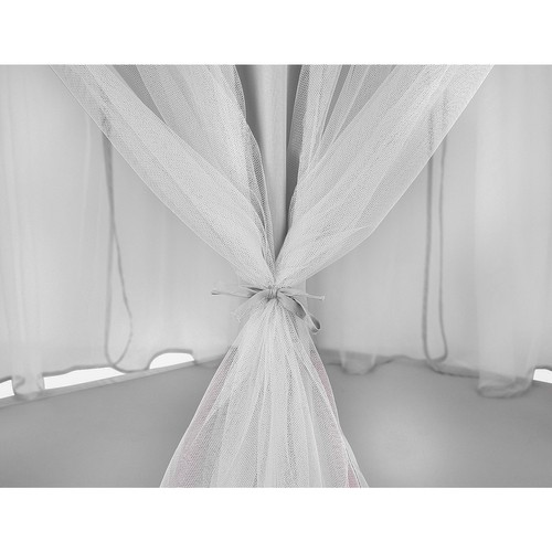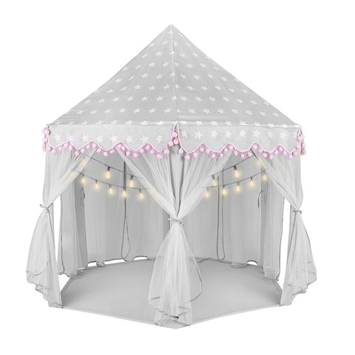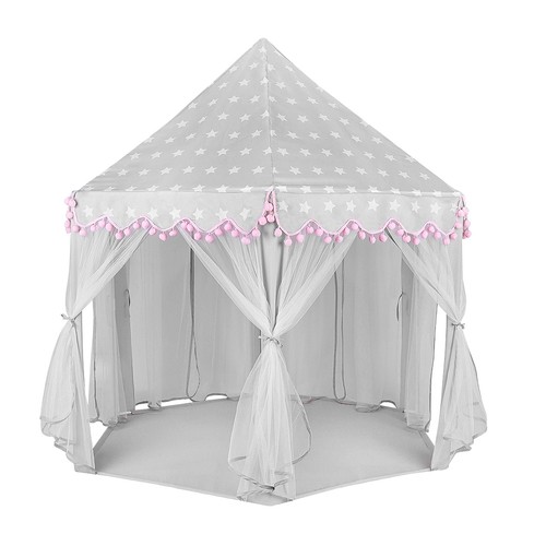 Namiot dla dzieci to wspaniały sposób na kreatywną i fantazyjną zabawę w domu, jak i poza nim. Pobudza wyobraźnię i pozwala na radosne spędzenie czasu samemu lub w większym gronie, bez ograniczenia wiekowego. Materiałowy zamek zdecydowanie jest niezastąpionym kompanem podczas dziecięcych figli. Ma podstawę sześciokąta, posiada 6 otworów wejściowych i stożkowy daszek. Wejścia są zasłonięte półprzezroczystymi, białymi firankami, które doskonale komponują się z pozostałą częścią namiotu. Gardinki można przewiązać bądź udrapować na różne sposoby przy pomocy ozdobnych tasiemek Zastosowane rozwiązanie wraz z kokardkami dodaje uroku, a także urozmaica zabawę.