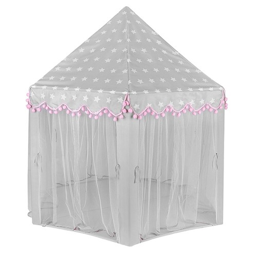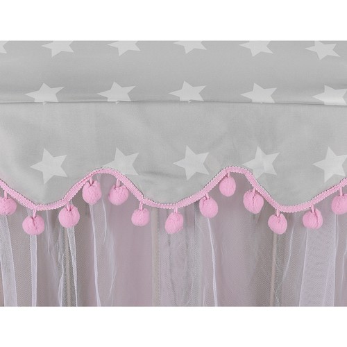 - NOWY, ULEPSZONY MODEL – stworzyliśmy zupełnie, nowy, ulepszony model namiotu. Zastosowaliśmy połączenie koloru różowego i szarego z motywem gwiazdek. Dodatkowo na falbankach znajdują się przepiękne pomponiki, które jeszcze bardziej go uatrakcyjniają. Namiot posiada 6 otworów wejściowych i stożkowy daszek. Całość fantastycznie się prezentuje i będzie doskonale pasowało w każdym pokoju.