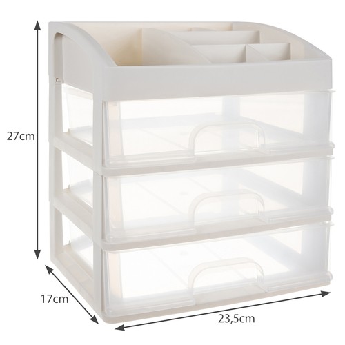 - 3 PRZEŹROCZYSTE SZUFLADY – organizer został wykonany z transparentnego materiału, dzięki czemu dobrze widać, co jest w środku, a więc szybko można zlokalizować dany przedmiot, by po niego sięgnąć. Posiada 3 szuflady transparentne o tym samym wymiarze.