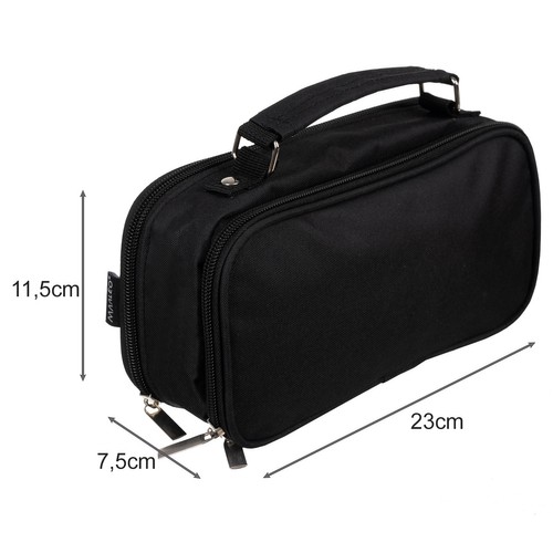 SPECYFIKACJA – kolor: czarny; materiał zewnętrzny: poliester + pozostałe elementy: nylon + żelazo, wypełnienie: bawełna PP, podszewka: poliester; materiał wewnętrzny: poliester + nylon + guma + wypełnienie: MDF); wyposażenie: brak; ilość komór: 2; wymiary: 11,5 x 7,5 x 23 cm; waga: 0,145 kg; waga w opakowaniu: 0,155 kg.