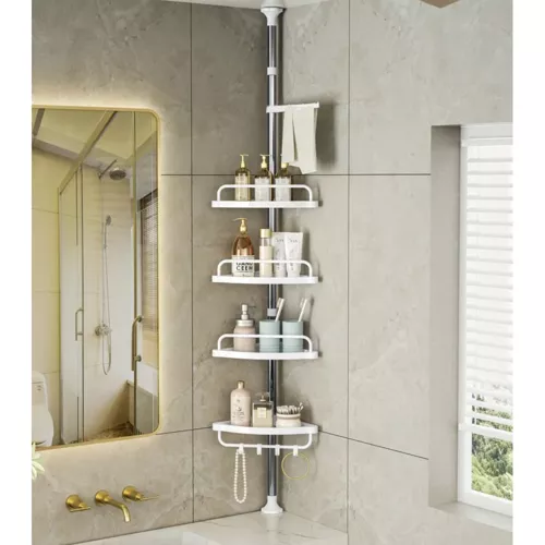- 4 POZIOMY I WIESZAK – organizer łazienkowy posiada 4 półki oraz wieszak, które można niezależnie ustawiać na różnej wysokości oraz dowolnie okręcać je wokół osi drążka mocującego.