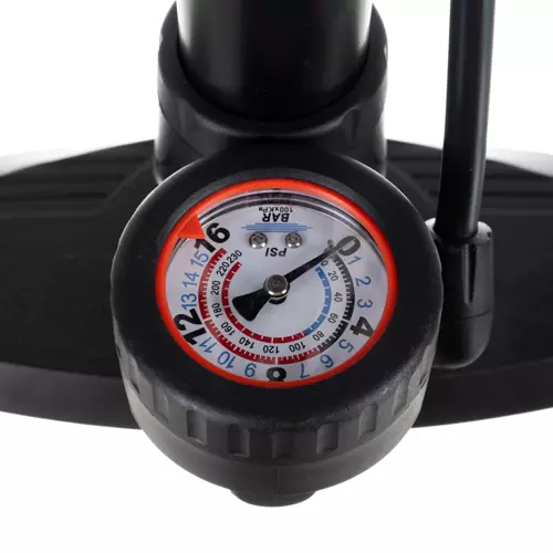 • WBUDOWANY MANOMETR W BAR I PSI– pompka ma wbudowany manometr, dzięki temu wiesz w którym momencie przestać pompować. Maksymalne ciśnienie na manometrze to 16 bar / 230 PSI.