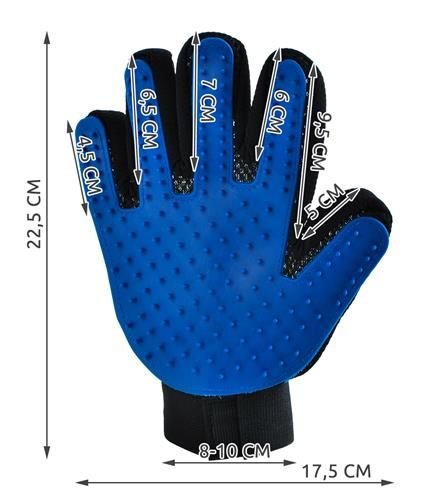 Rękawiczka została specjalnie zaprojektowana w sposób, który sprawia, że spełnia funkcję szczotki i powoduje, że wyczesywanie sierści to nieskomplikowana, szybka i skuteczna czynność. Górna część rękawicy wykonana jest z czarnego, miękkiego poliestru, natomiast dolna (aktywna) posiada liczne niebieskie, silikonowe wypustki rozmieszczone równomiernie na całej powierzchni, która w całości jest efektywnie wykorzystywana. Zastosowane rozwiązanie wpływa na komfort i satysfakcję podczas użytkowania. Nadmiar sierści zbiera się pomiędzy wypustkami, nie spada na podłogę ani nie wzbija się w powietrze. Sierść po zakończeniu czesania można bez problemu „odkleić” i wyrzucić do kosza na śmieci lub do toalety. Rękawiczkę bez najmniejszych trudności wyczyścimy przy użyciu wody z mydłem.