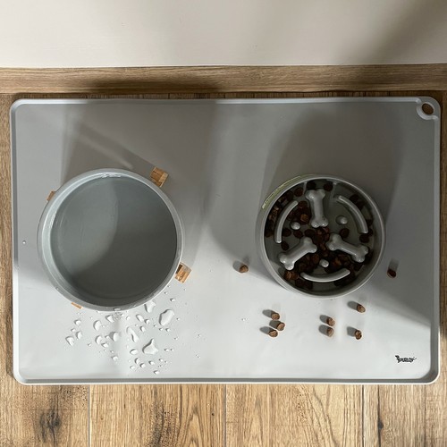 ?? rozmiar i dopasowanie – podkładka jest wystarczająco duża, by pomieścić dwie miski o różnych rozmiarach, zapewniając odpowiednią przestrzeń