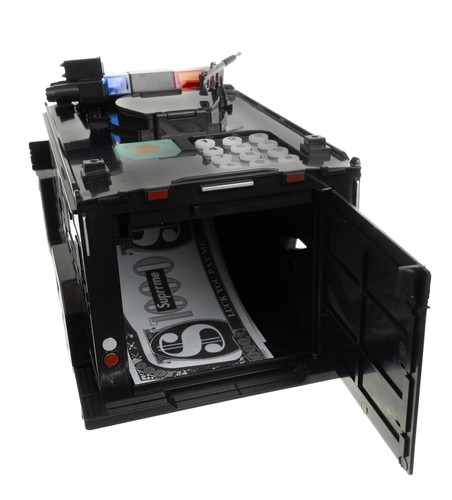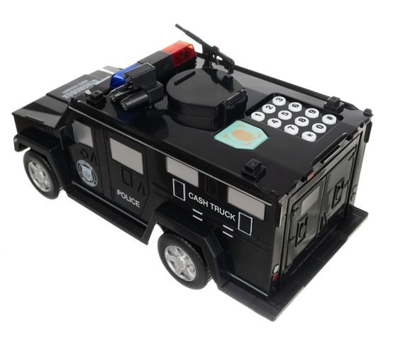 - NA MONETY I BANKNOTY – samochód policyjny skarbonka może przechowywać zarówno monety (specjalny otwór w dachu na monety), jak i całe banknoty, które wciąga automatycznie po zbliżeniu do części dachowej. Skarbonka policja posiada dużą przechowalnię, więc bez problemu pomieści sporą ilość gotówki.