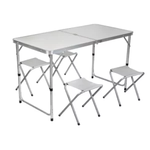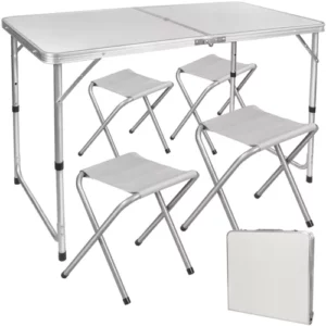 ZESTAW KEMPINGOWY – STÓŁ + 4 KRZESEŁKA REGULOWANA WYSOKOŚĆ – trzy-poziomowa regulacja stołu pozwala na indywidualne dopasowanie wysokości do własnych potrzeb. Dzięki temu stół będzie odpowiedni zarówno dla dorosłych jak i dla dzieci. Bez problemu możemy go wykorzystać jako zestaw nawet podczas przyjęcia urodzinowego dziecka. ŁATWY MONTAŻ – zestaw rozkłada się jak i składa zaledwie w niecała minutę….