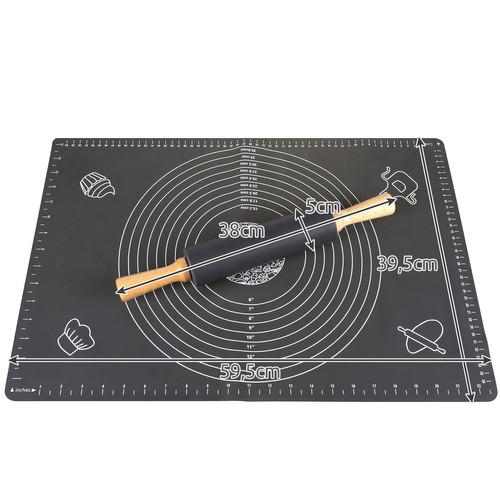 - SPECYFIKACJA – materiał: silikon + wałek materiał: drewno, pozostałe: PP + silikon; posiada podziałki: tak; odporna na temperaturę: tak; łatwa w czyszczeniu: tak; elastyczna: tak; możliwość używania w piekarniku: max temp. 260stC; możliwość używania w zamrażarce: -60stC; możliwość mycia w zmywarce: tak; wymiary wałka: 38 x 5 cm; wymiary stolnicy: 59,5 x 39,5 cm; waga: 0,525kg; waga w opakowaniu: 0,602 kg.