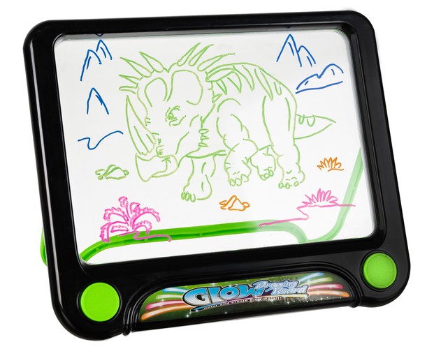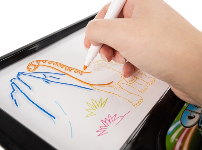 - PODŚWIETLENIE LED – podstawa zawiera 5 diod LED, które wytwarzają dużą ilość światła, tak by efekt fluorescencji był zjawiskowy! Jak rozpocząć zabawę? To proste. Umieść szablon z rysunkiem w podświetlanej tablicy. Odwzoruj na panelu to co jest na wzorniku przy użyciu specjalnych fluorescencyjnych mazaków, jeżeli czujesz się na siłach możesz samodzielnie wykonać rysunek. Włącz oświetlenie. Kolory mazaków będą się zmieniać pod wpływem światła. Pamiętaj, że najlepsze efekty są widoczne w ciemności.