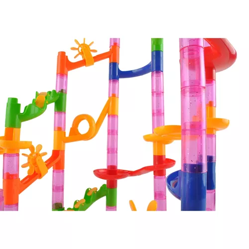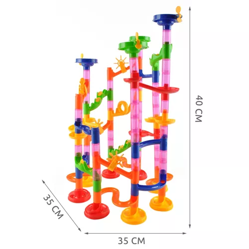 - AŻ 105 ELEMENTÓW TORU I 30 KULEK W ZESTAWIE – 105 elementów toru pozwala na tworzenie zróżnicowanych konfiguracji, a jedynym ograniczeniem jest wyobraźnia. Różnorodność wariantów połączenia poszczególnych elementów powoduje, że wyzwanie jest naprawdę ekscytujące. W komplecie znajduje się dodatkowo 30 kulek, dla których można skonfigurować atrakcyjne trasy zjeżdżania.