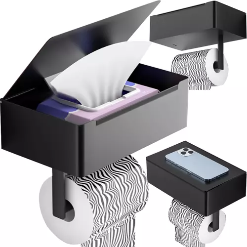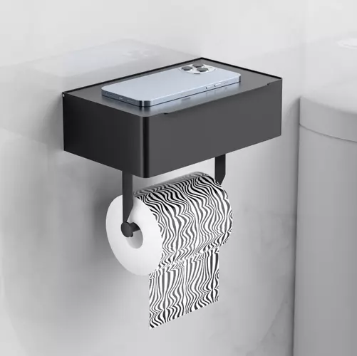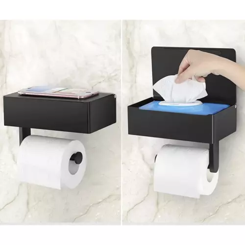 - Z PUŁKĄ – uchwyt na papier toaletowy z zamykana półką na mokre chusteczki ma dwuwarstwową strukturę. Pudełko do przechowywania mokrych chusteczek lub produktów kobiecych, a poniżej uchwyt na papier toaletowy. Niezbędne przedmioty są dobrze zorganizowane, a półka na górze może być wykorzystana do tymczasowego położenia telefonu, dzięki czemu toaleta wygląda schludniej i czyściej.