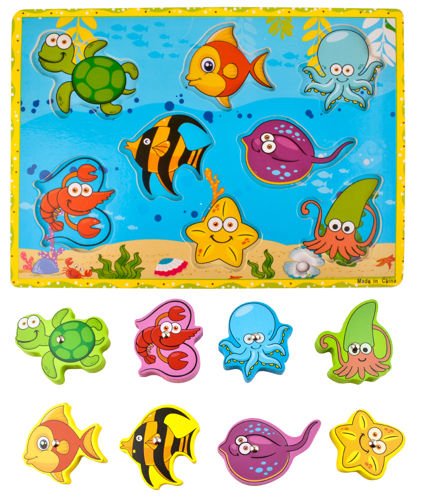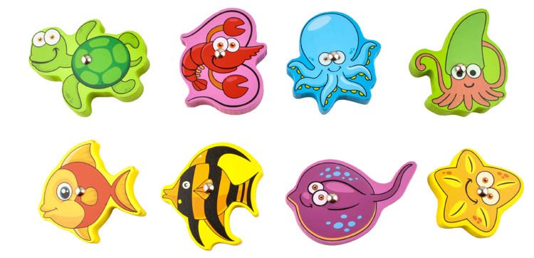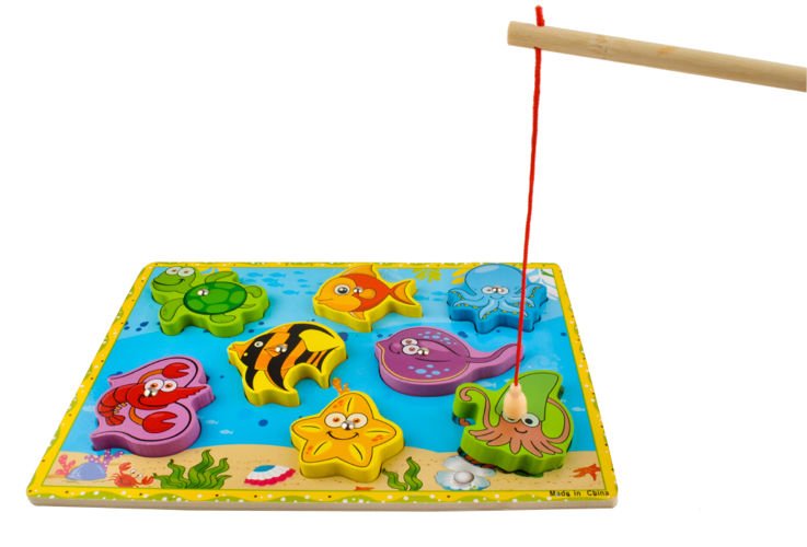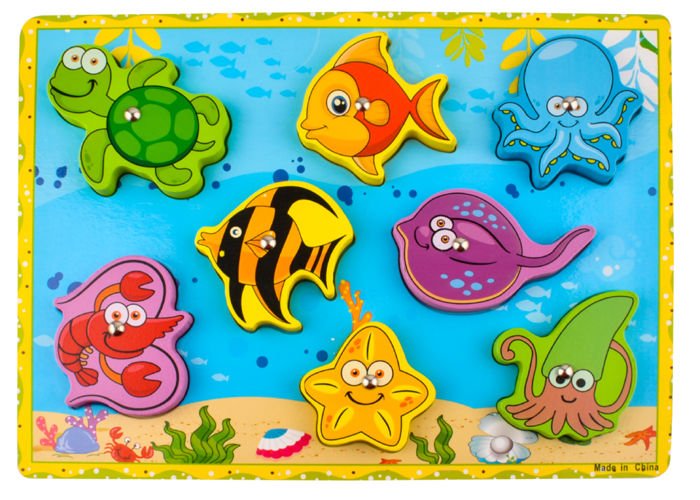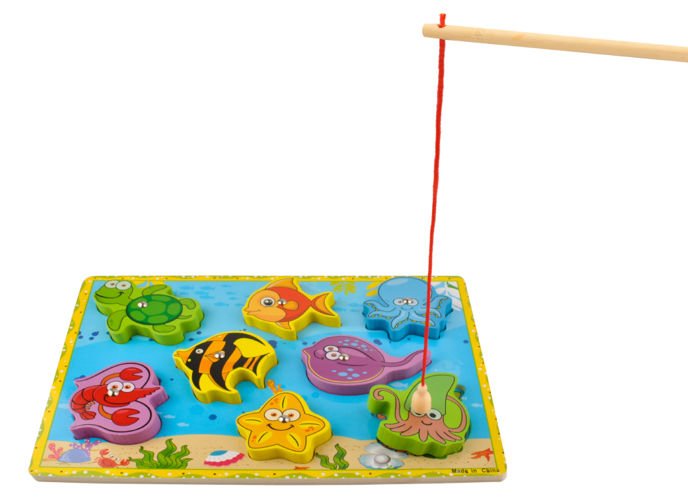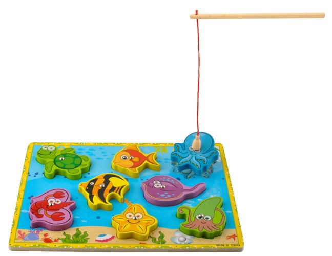 - 10 ELEMENTÓW – w zestawie znajduje się tablica na której ułożone jest 8 wodnych zwierzątek posiadających metalowe pinezki. Do kompletu dołączona jest wędka, przy użyciu której można wyjmować z tablicy zwierzątka. Magnesy są bardzo silne, dlatego bez problemu nawet 3 letnie dziecko poradzi sobie z łowieniem rybek.