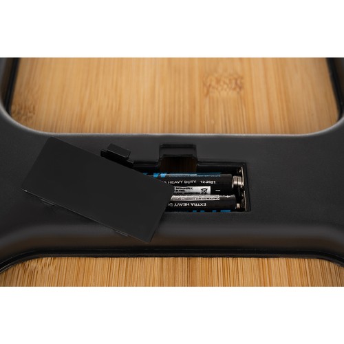 - SPECYFIKACJA – materiał: bambus, pozostałe: PP + PVC; jednostka wagi: kg i lb; waga minimalna: 0,002 kg, waga maksymalna użytkownika: 180 kg; wyświetlacz: LCD; automatyczne wyłączenie: po 8 sekundach; zasilenie: 2 x bateria AAA; wskaźnik naładowania baterii; pomiar temperatury otoczenia; wymiary: 28 x 28 x 3 cm; waga: 0,856 kg; waga w opakowaniu: 0,967 kg.