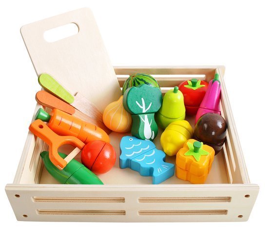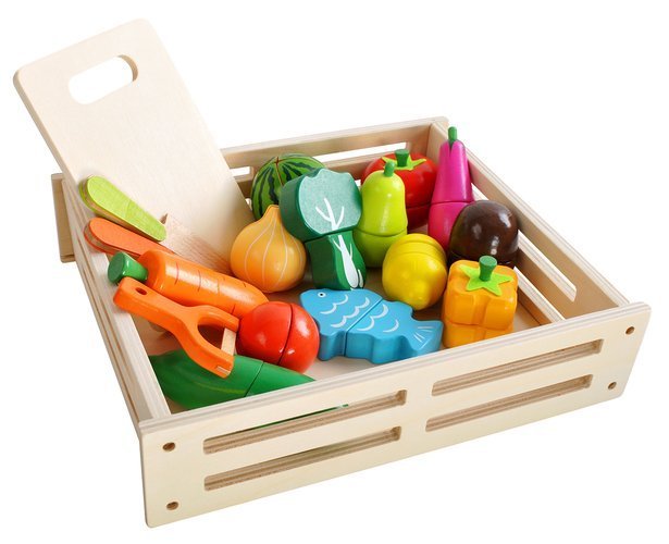 WARZYWA DO KROJENIA DREWNIANE Z AKCESORIAMI W SKRZYNCE