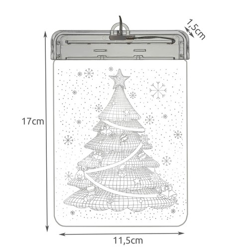 - SPECYFIKACJA – barwa światła: biała ciepła; wzór na witrażu: choinka; ilość lampek w taśmie LED: 6; zasilanie baterie: 3 x AAA (brak w zestawie) wymiary: 17 x 11,5 x 1,5 cm; długość kabla: 19 cm; wymiary opakowania: 18 x 12,5 x 4,5 cm; waga: 108 g; waga w opakowaniu: 121 g.
