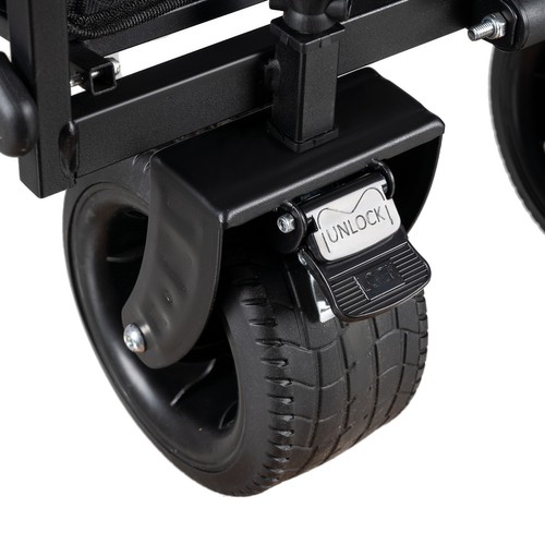 - SZEROKIE SKRĘTNE KOŁA – wózek wyposażony jest w szerokie bieżnikowane koła wykonane z wysokiej jakości materiału PP, które zapewniają stabilność i łatwość manewrowania na różnych powierzchniach. Koła z przodu wózka są skrętne w pełnym zakresie 360 stopni, co umożliwia precyzyjne sterowanie i łatwe manewrowanie w ciasnych przestrzeniach. Ponadto posiadają hamulce / blokady, co gwarantuje bezpieczeństwo i stabilność podczas załadunku oraz rozładunku. Duże, bieżnikowane koła to pewność, że wózek pokona zarówno piaszczystą plażę, jak i nieutwardzony grunt w ogrodzie.