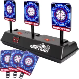 TARCZA ELEKTRONICZNA – STRZELNICA – 3 CELE TARCZA 3 CELE – ta wyjątkowa tarcza pozwoli poczuć się Twojemu dziecku jak prawdziwy strzelec. Urządzenie wyposażone zostało w wyświetlacz LCD, który wyświetla zdobyte punkty. Po ustrzeleniu wszystkich celi – automatycznie podnoszą się do góry. Dziecko może rywalizować z rówieśnikami lub najbliższymi o miano najlepszego strzelca. EFEKTY DŹWIĘKOWE – po trafieniu w jeden z trzech…