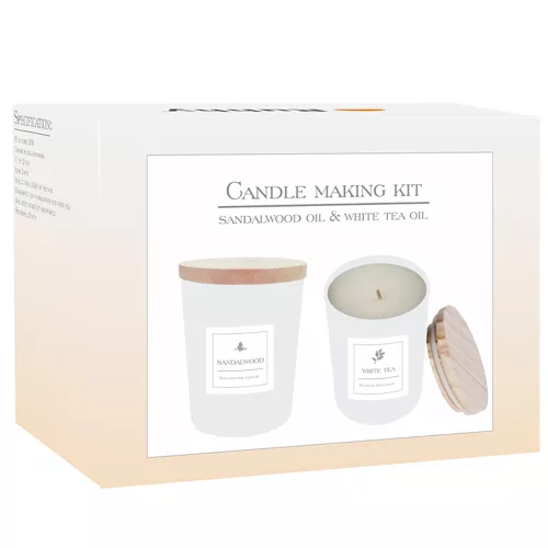 - 36 W 1 – ten duży zestaw posiada aż 36 elementów. Pozwala on stworzyć 2 kompletne świece. W zestawie znajdują się: 2x słoiki z pokrywką wielokrotnego użytku; 2x naklejki na słoiki; 2x olejki perfumowane; 2x knoty bawełniane; 2x torebki wosku; 2x zagniatarki do wosku; 1x naczynie do topienia wosku; 1x łyżeczka; 20x okrągłych naklejek do knotów; 2x barwnik.