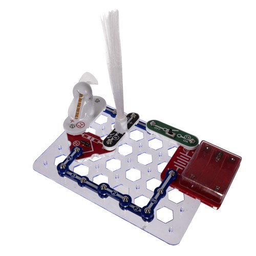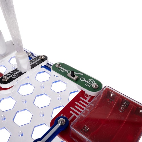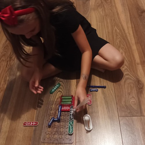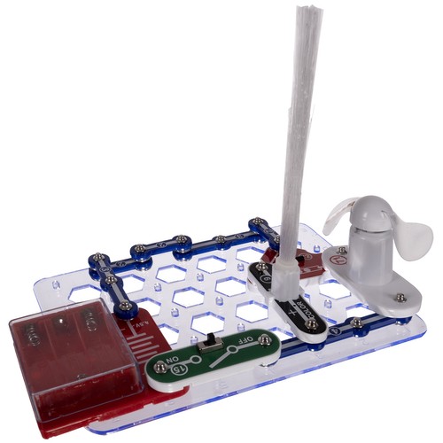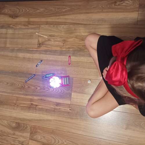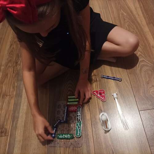 - EFEKTY ŚWIETLNE ORAZ RUCHOWE – po złożeniu oraz włączeniu włącznika on/off pojawiają się efekty takie jak: uruchomienie silniczka w wiatraczku oraz zapalenie się lampek. Daje to niezwykłe efekty oraz radość dla dziecka że stworzyło samodzielnie działający układ elektroniczny.