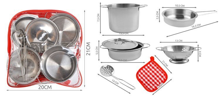 - 13 ELEMENTÓW – w zestawie znajduje się 13 elementów, czyli wszystko co jest potrzebne dla małego kucharza: 2 garnki, patelnia, durszlak, pokrywka (pasuje do każdego garnka), komplet różnego rodzaju łyżek, plecaczek oraz materiałowa podkładka wraz z rękawiczką.