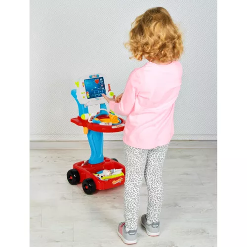 - WÓZEK + 18 ELEMENTÓW – ilość części pozwala na praktyczne wykorzystanie zestawu. 18 przyrządów lekarskich oraz 2-poziomowy wózek z imitacją ekranu EKG i uchwytem umożliwiają urozmaiconą, kreatywną i wielokrotna zabawę.