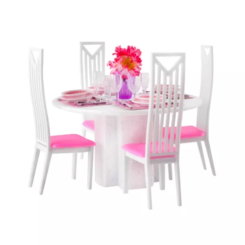 - DUŻY ZESTAW – w zestawie znajduje się stół z 4 krzesełkami, zestaw talerzy oraz komplet sztućców, 8 kieliszków do wina, a także dekoracyjny wazon z kwiatkami. Całość umożliwia kreatywne wykorzystanie i interesującą zabawę.