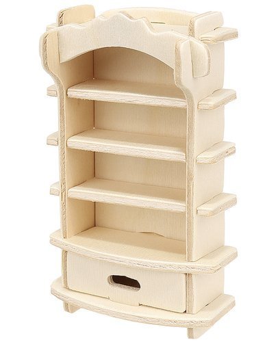 W zestawie znajduje się 34 różnych mebelków z ruchomymi elementami tj otwierane szafki. Mebelki będą kompletnym wyposażeniem każdego domku dla lalek. Komplet zawiera m.in. szafę, komodę, toaletkę z krzesełkiem, łóżko podwójne, łóżko pojedyncze, stół z krzesłami, konik bujany, umywalkę, toaletę, zestaw kuchenny i wiele innych. Mebelki występują w formie puzzli drewnianych – 3D, należy je samodzielnie złożyć.